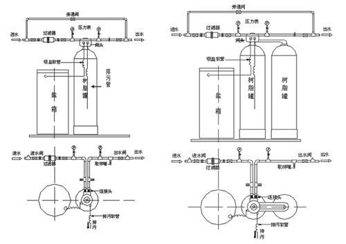 運 行:原水流經裝有離子交換樹脂的罐體,樹脂中所含的Na+離子與水中的陽離子(Ca2+、Mg2+等)進行離子交換,使出水的Ca2+、Mg2+含量達到設計要求。